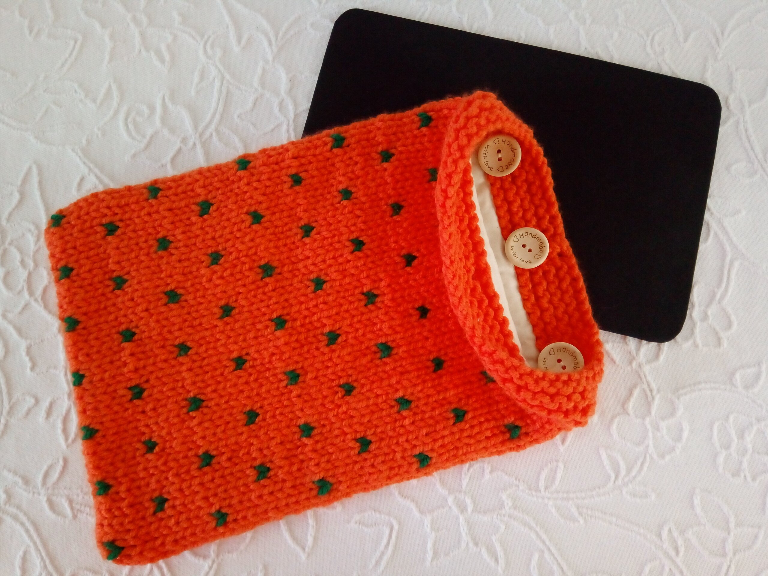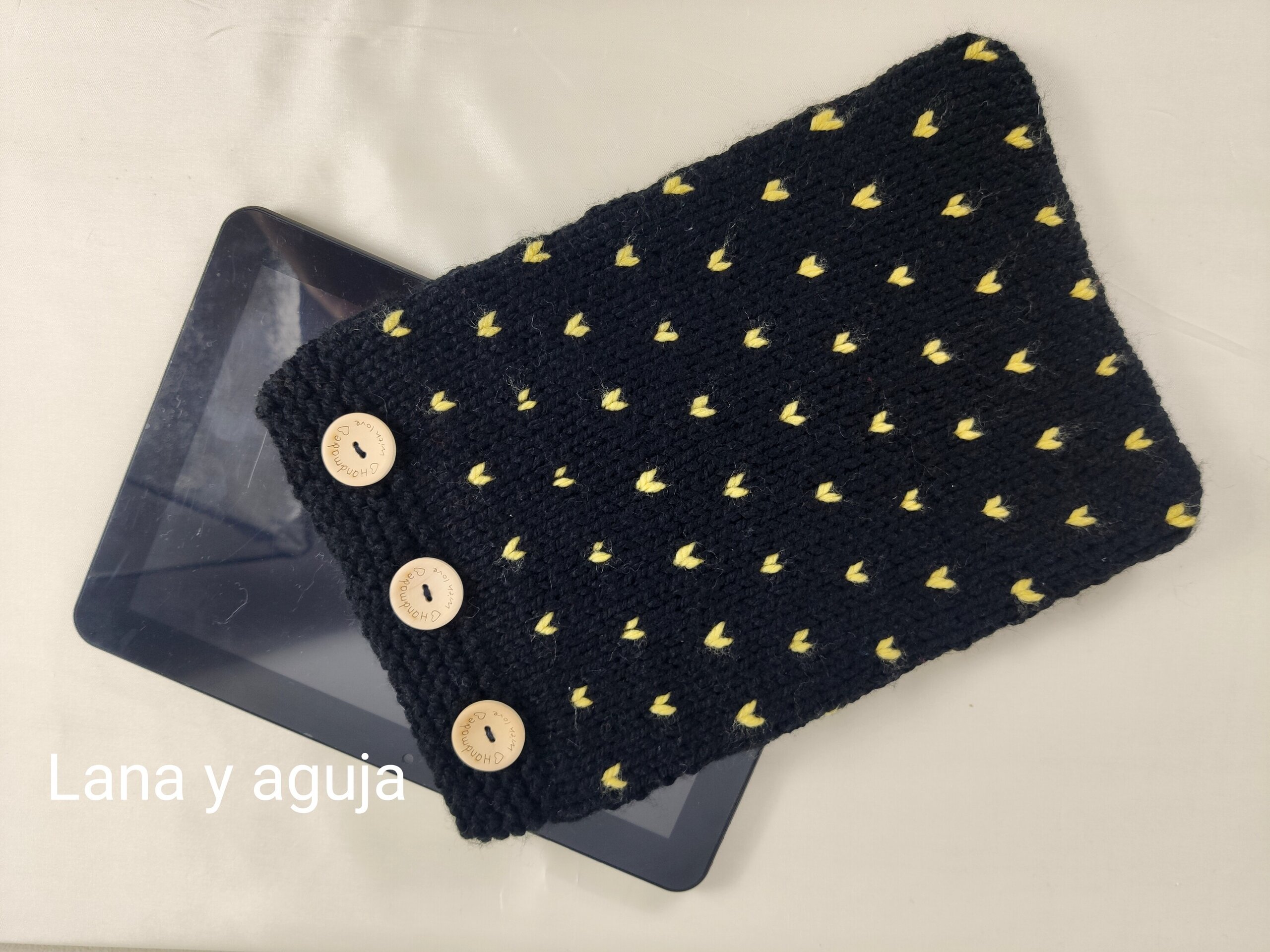 Protector para pantallas electrónicas. Funda de lana tejida a mano. Interior forrado con tela. Las medidas de la pantalla es de 26 cm por 17 cm. Diseño único. Regalo original.