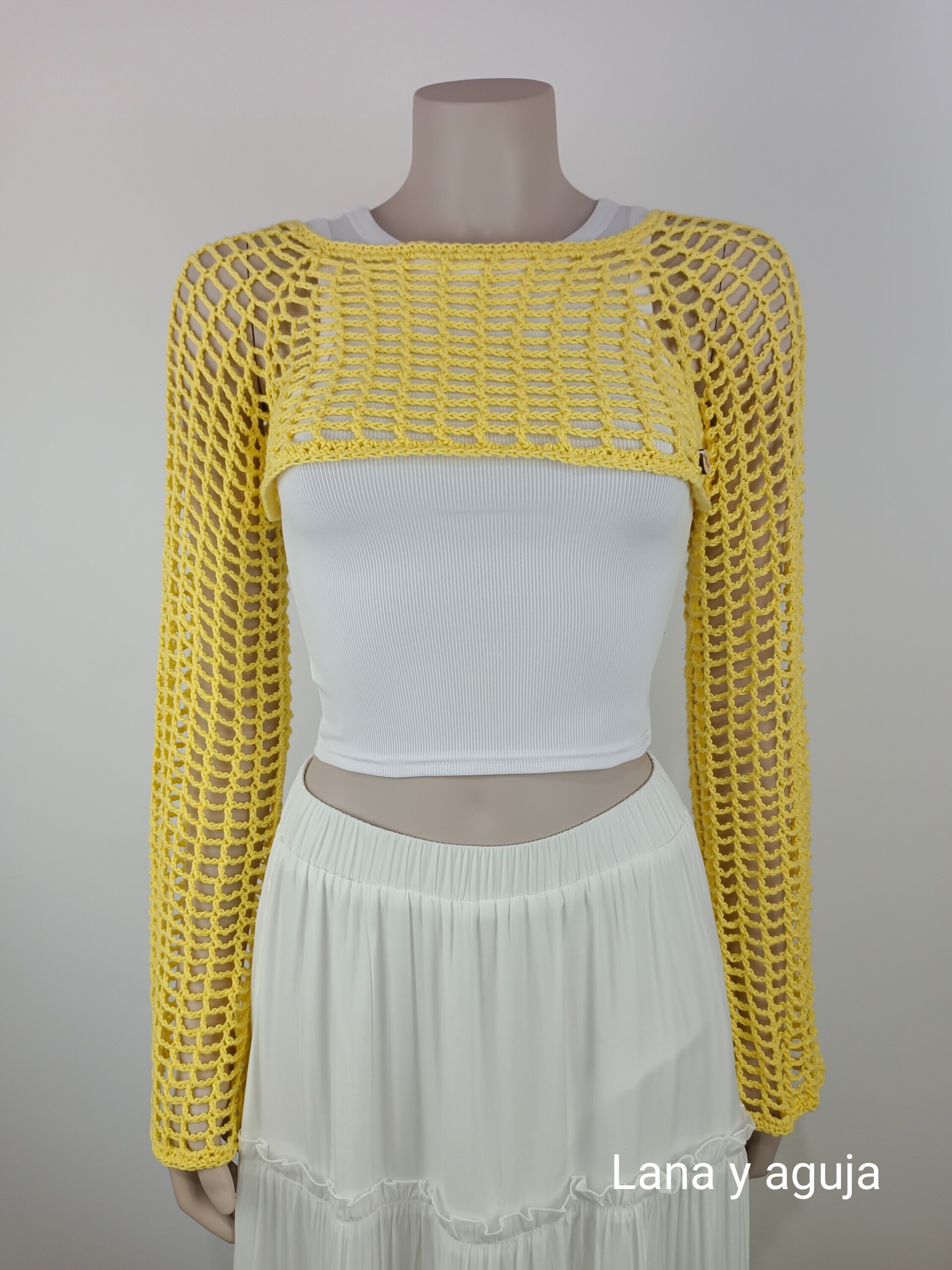 Jersey corto con manga larga, Talla S, tejido a mano, hecho en crochet.