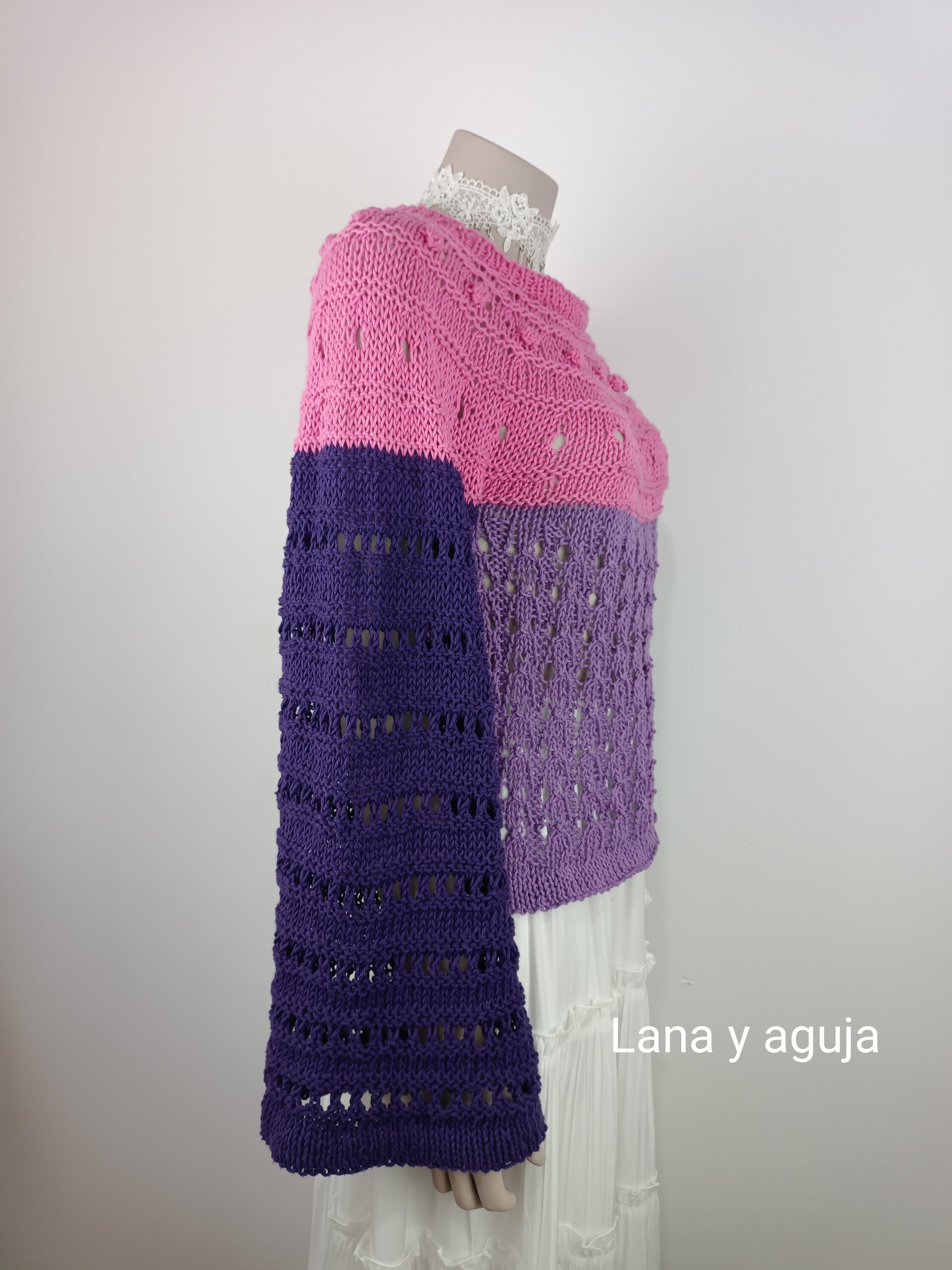 Jersey de lana de algodón tejido a mano para mujer. Hecho en varios colores y con dibujos diferentes, ideal para combinar con muchas prendas distintas. Es un jersey de cuerpo corto y de mangas largas un poco acampanadas Combina con un estilo informal y casual.